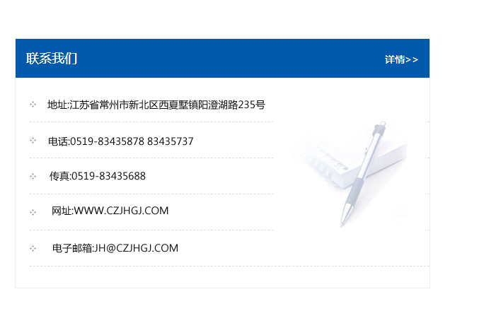 地址:常州市新北區友邦商務大廈1幢16、17層  電話:0519-85101652  傳真:0519-85112595  郵編:213022  網址:www_cz-jiayue_cn.sh-ganghao.com  郵箱:xiajifengaa@163.com